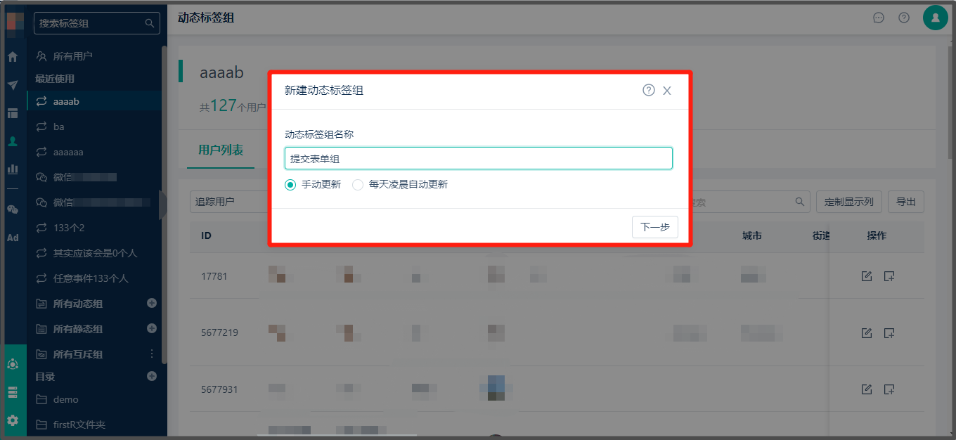 首先创建一个动态标签组【提交表单】,选择【手动更新】或【每天凌晨自动更新】