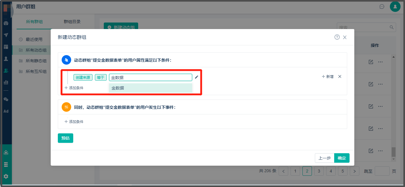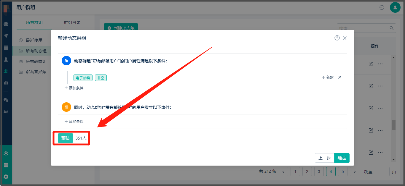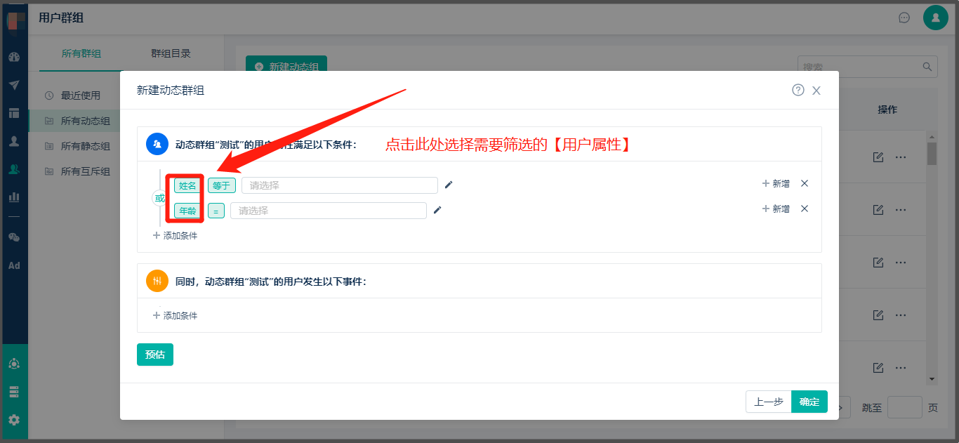 * 查看路径:【用户群组】> 点击【新建动态组】> 输入动态标签组名称 > 选择筛选条件 > 点击【预估】可以快速查看人数