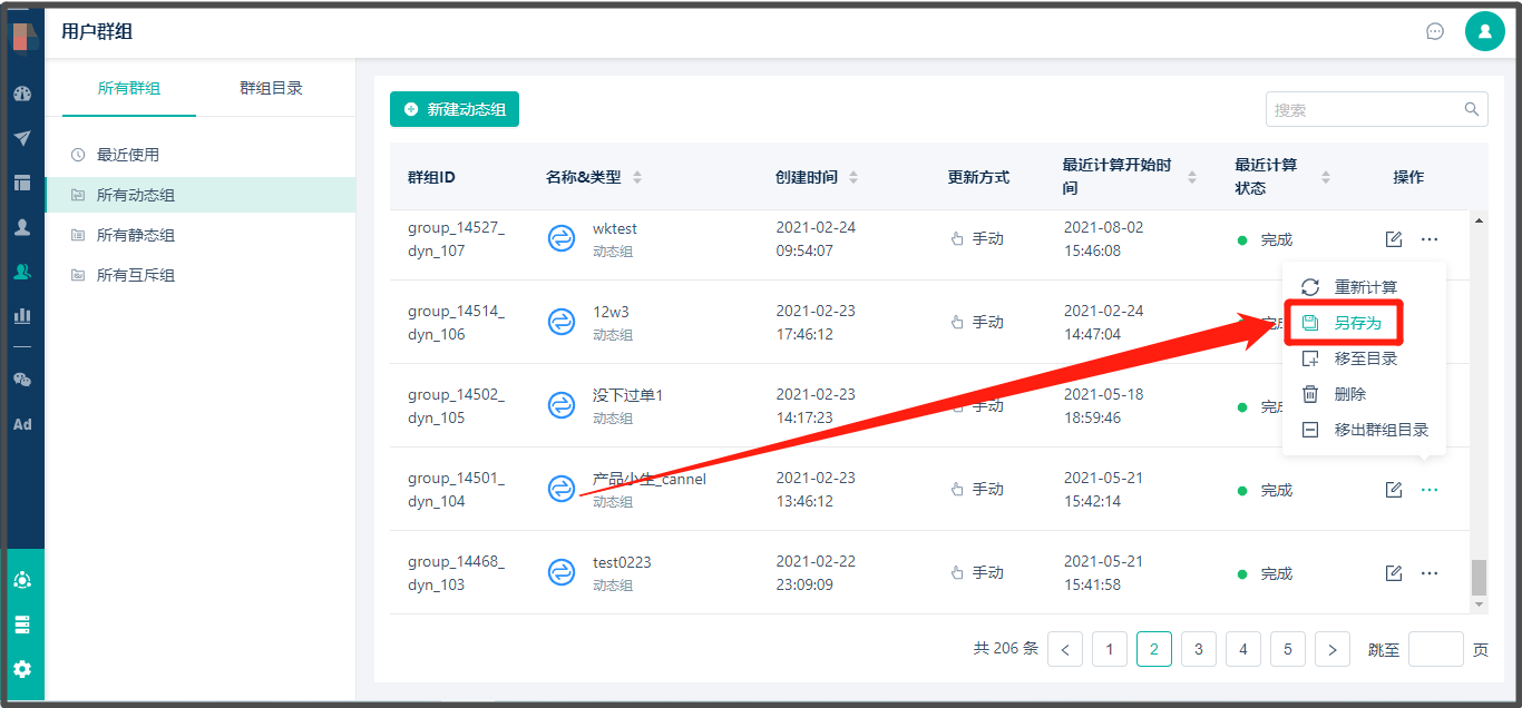 * 路径:【用户群组】> 找到需要复制的动态标签组 > 点击【另存为】