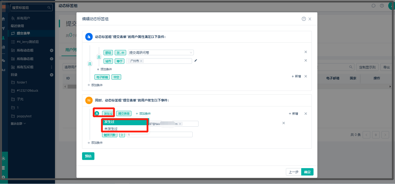 ——以前仅支持【发生过的事件】,系统升级后支持【反向事件】选择,比如:以前只能筛选提交过表单的用户,现在可以筛选出【未提交过表单】的用户,且支持二次嵌套的条件选择: