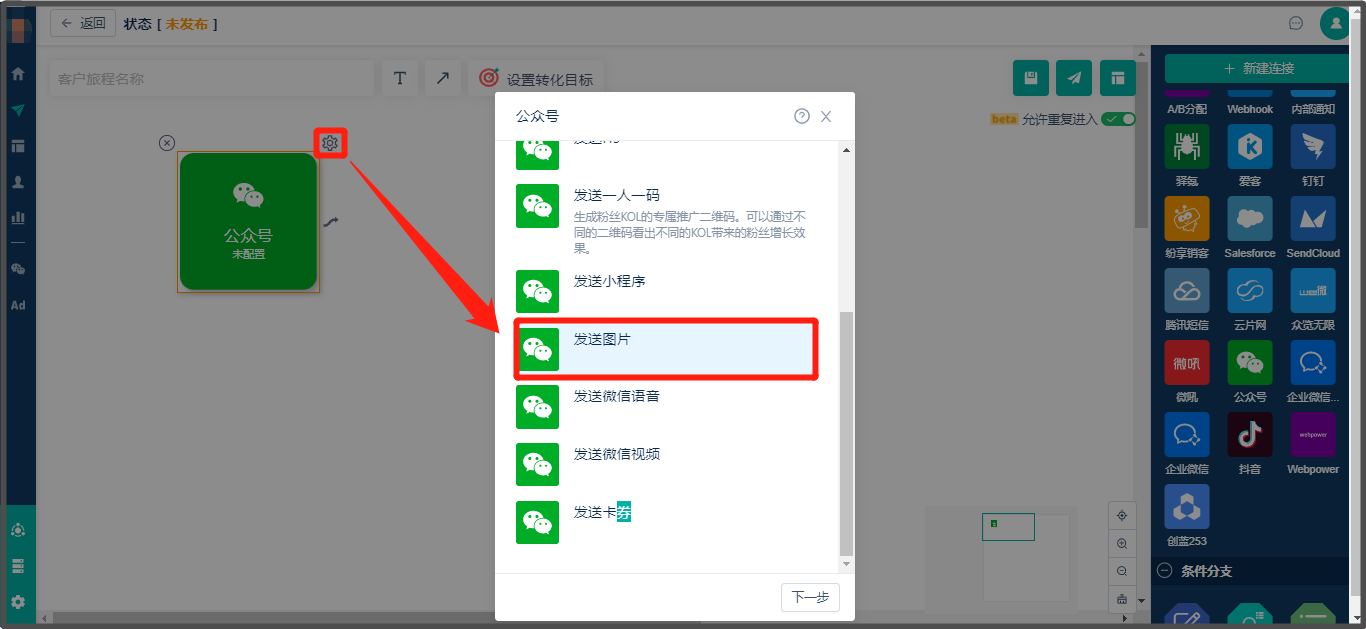 * 路径:【客户旅程】> 【新建客户旅程】> 【直接新建客户旅程】> 【执行动作】> 选择【微信公众号-执行动作】