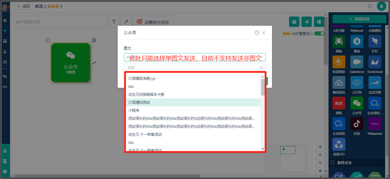 1. 由于微信限制,此处只能发送单图文消息,多图文消息无法选择(为灰色)和发送!
