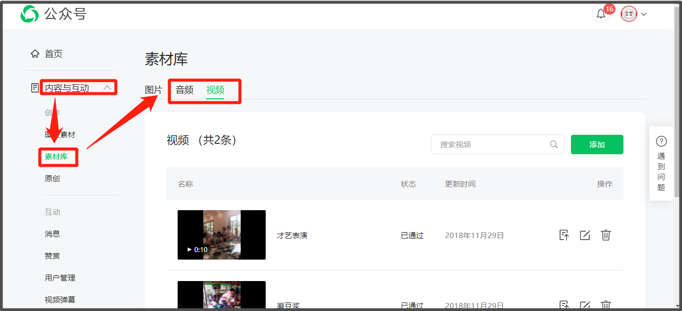 * 路径:登录微信公众号后台 > 点击左方的【内容与互动】> 【素材库】> 选择音频 > 点击【添加】