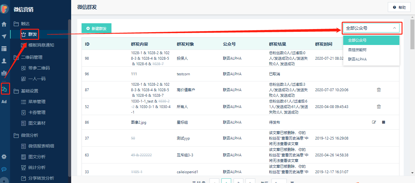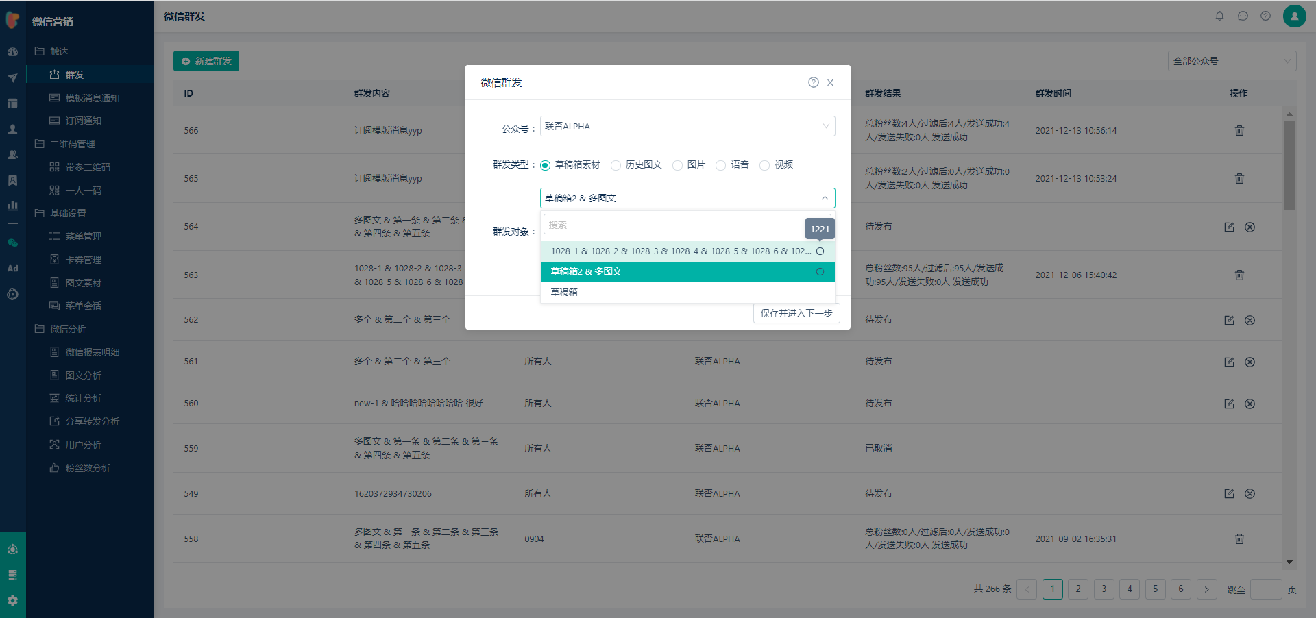 草稿箱素材和历史图文都可以群发,并支持图文说明的读取,以区分图文。