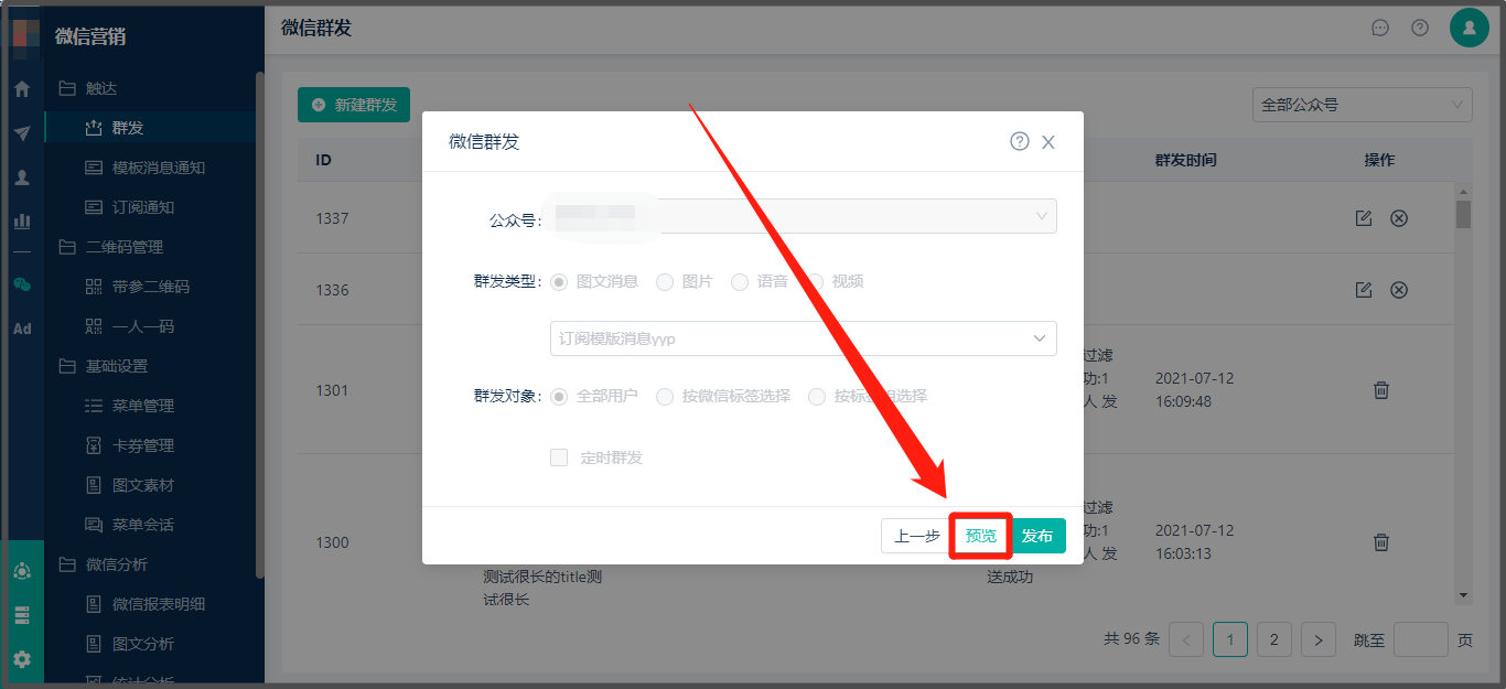 * 注:微信限制每天群发上限为100万,如需要提高上限,可以向微信申请提升额度。