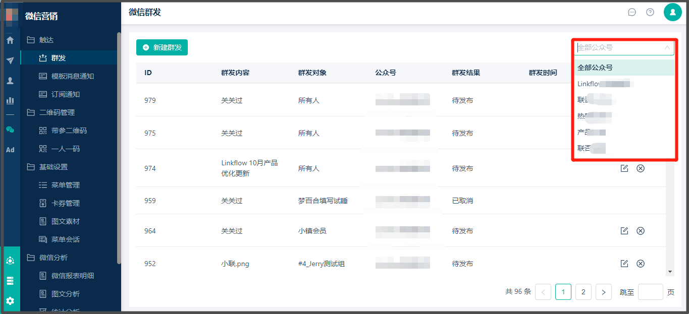 * [微信公众号](https://mp.weixin.qq.com/)与[Linkflow](https://app.linkflowtech.com/)对接后,通过[Linkflow](https://app.linkflowtech.com/)群发的消息,可以登录[Linkflow](https://app.linkflowtech.com/)删除。