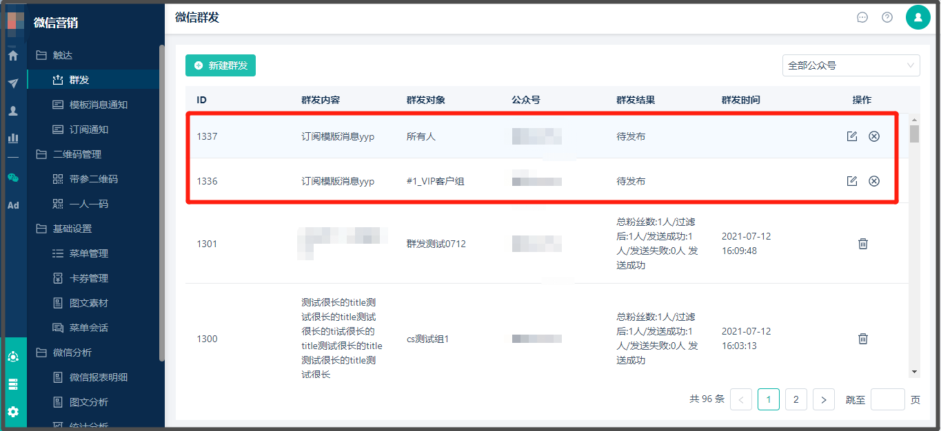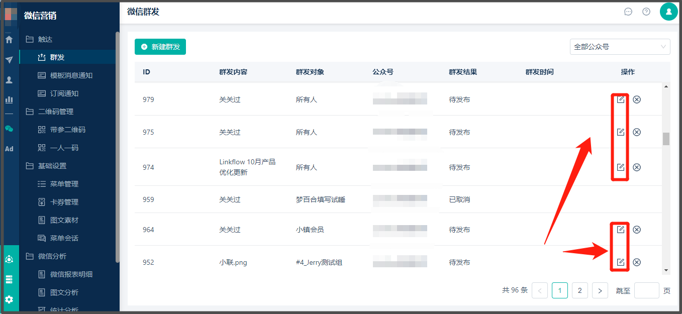 5. 对于【待发布】的微信群发消息,可以点击最右边的【编辑】按钮进入编辑页面,也可以点击【取消】按钮取消该微信群发消息。