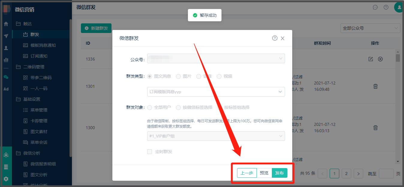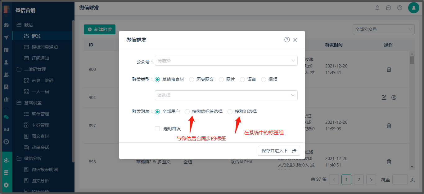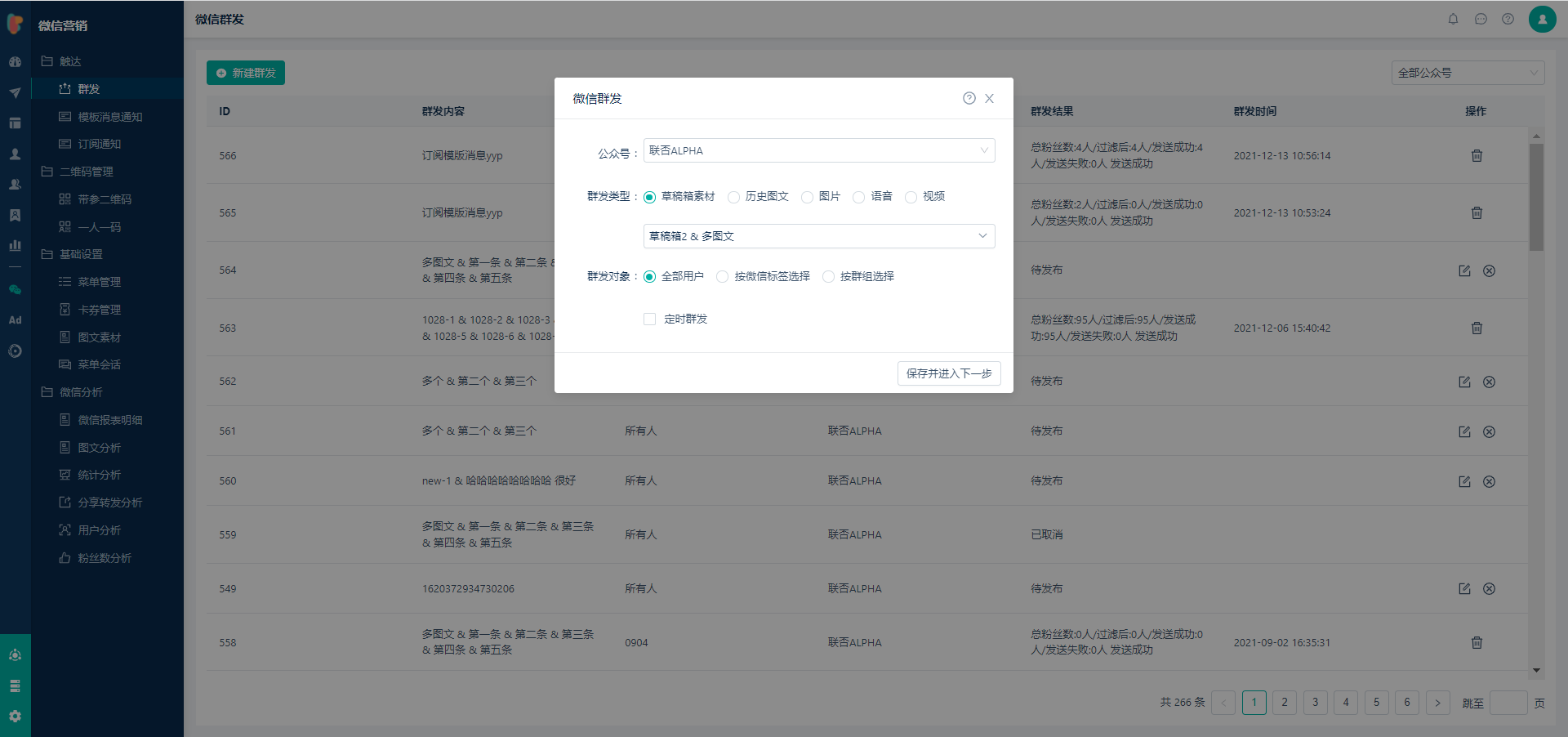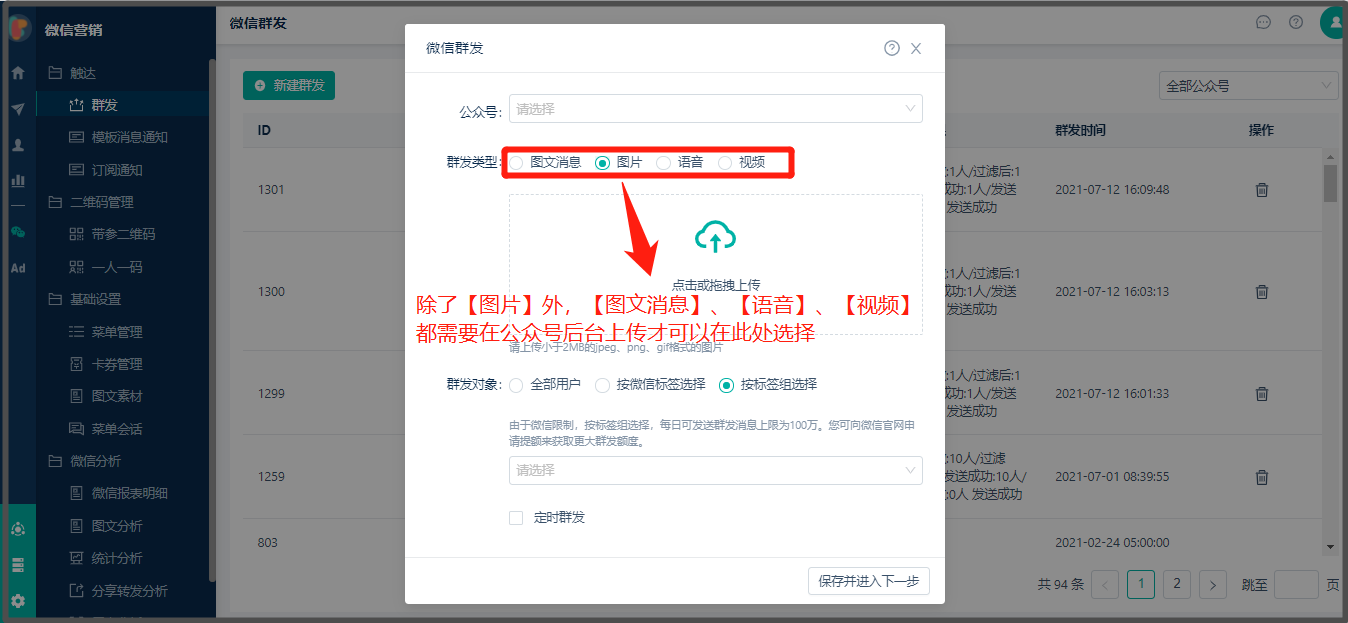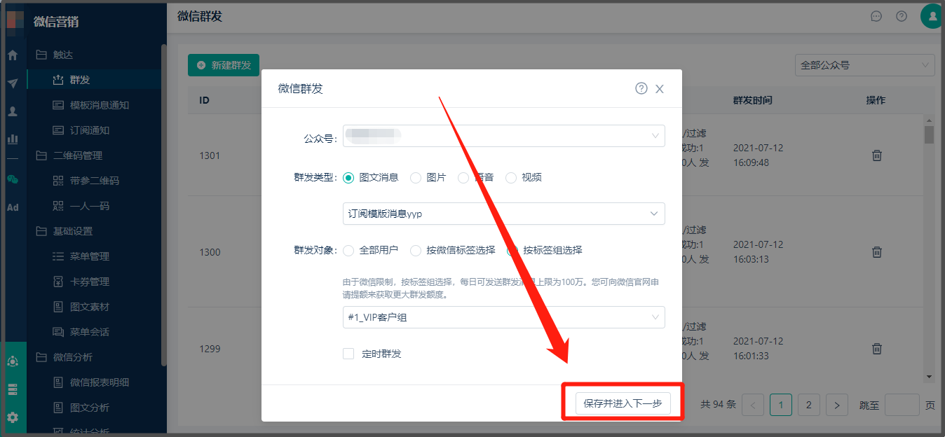 * 1. 保存并进入下一步:点保存并进入下一步按钮后,会保存一条群发记录,并进入预览、群发状态窗口