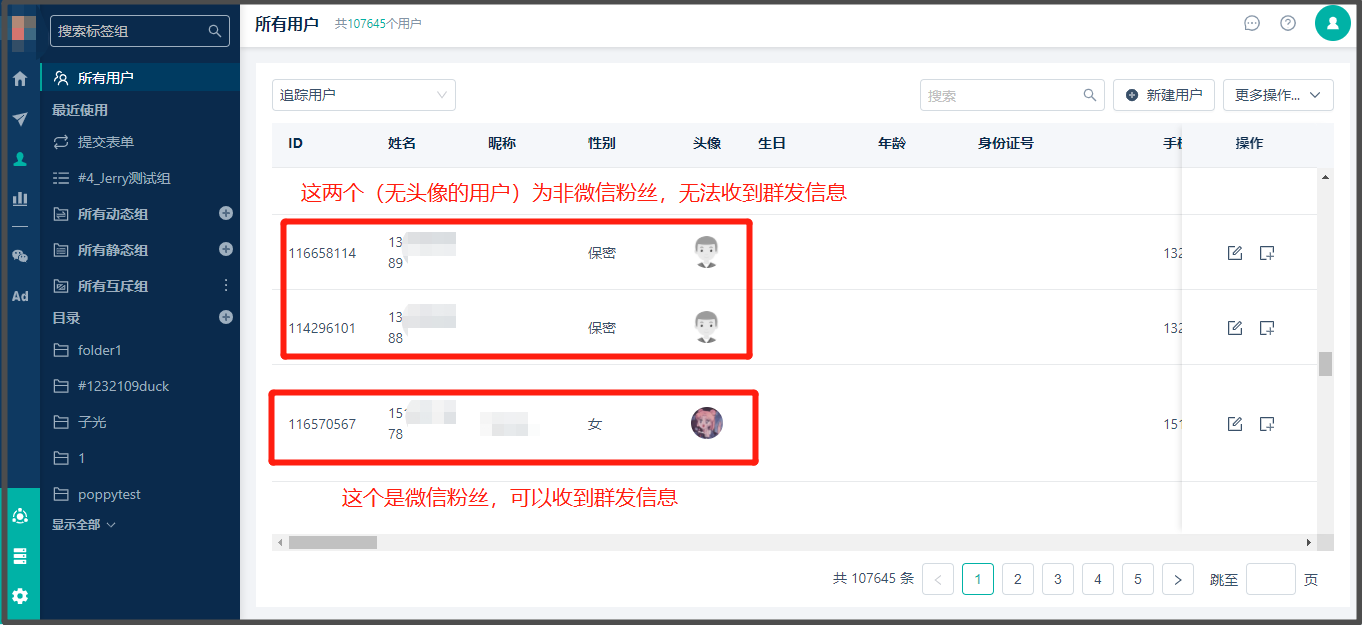 在[Linkflow](https://app.linkflowtech.com/)中的所有用户,但是选择后,只能群发给关注此群发公众号的粉丝,存在[Linkflow](https://app.linkflowtech.com/)中的用户,但是并非此公众号的粉丝,则无法收取;