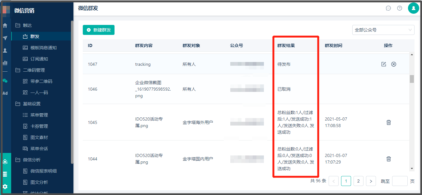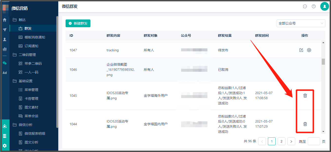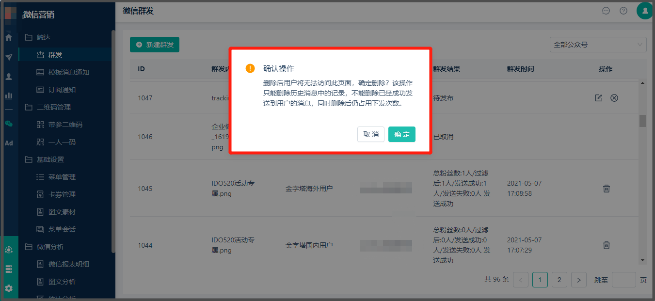 6. 对于已发布的微信消息,可以看到发送的状态(成功多少人和失败多少人),也可以点击最右边的【删除】按钮删除该消息的群发。请注意,删除对于已经收到微信消息的粉丝是无效的,删除仅对未收到微信消息的微信粉丝有效。