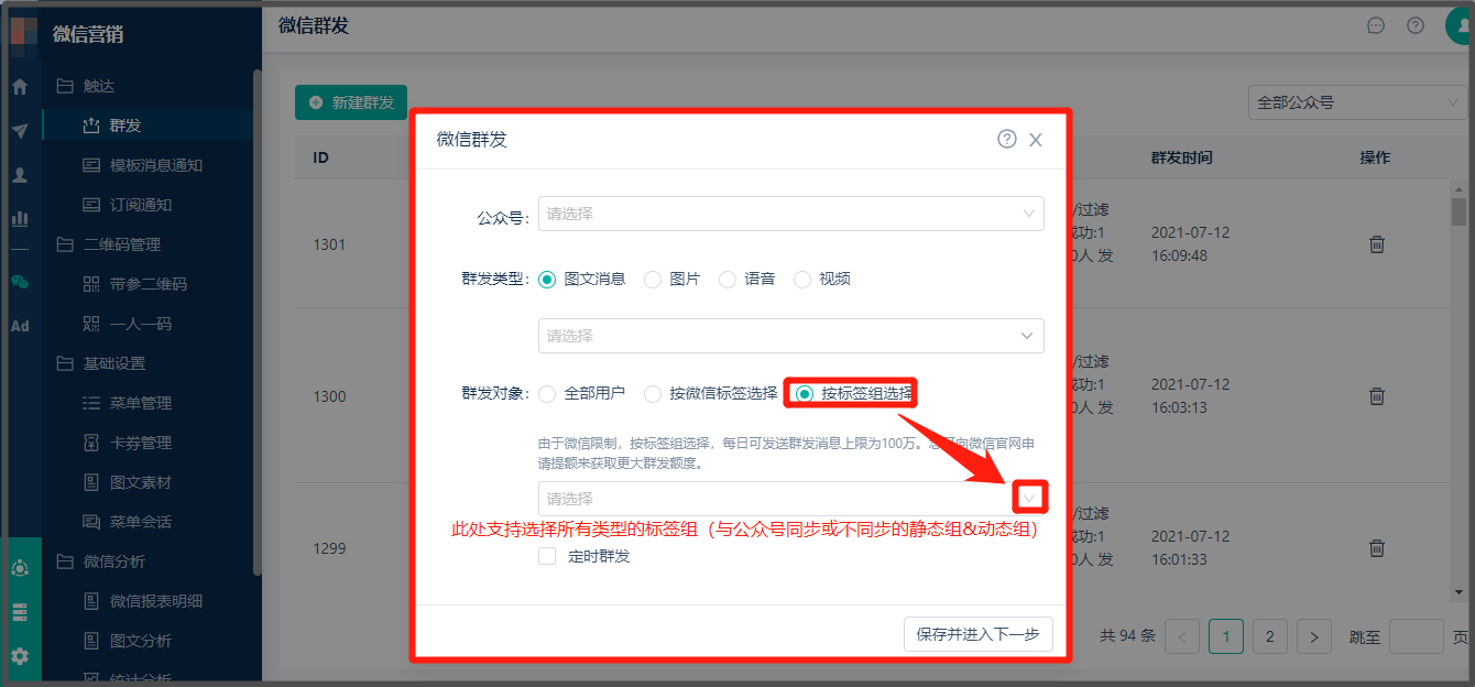 支持选择所有标签组,包括[静态标签组](%E9%9D%99%E6%80%81%E6%A0%87%E7%AD%BE%E7%BB%84.md)(与微信同步的或不同步的静态标签组均支持)、[动态标签组](%E5%8A%A8%E6%80%81%E6%A0%87%E7%AD%BE%E7%BB%84.md)。
