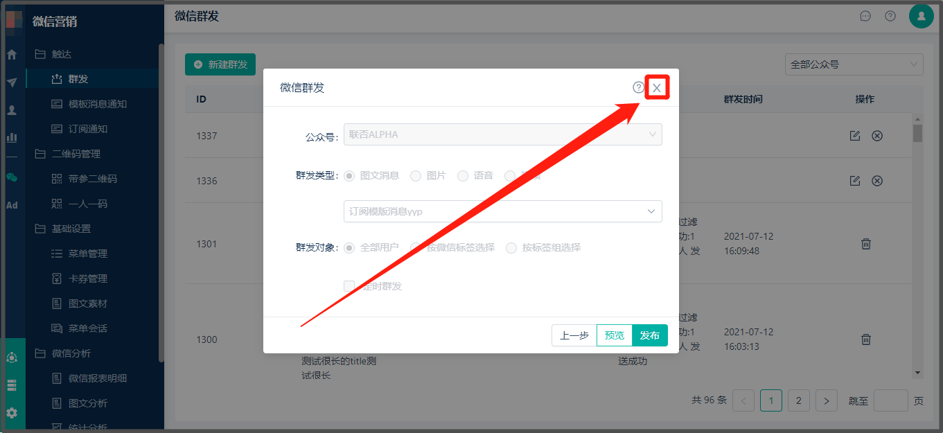 3. 关闭:如果您不想立即发布这个微信消息,可以点击右上方的【×】按钮关闭当前窗口,保存的群发会继续暂存在群发记录列表