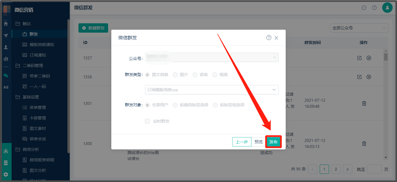 4. 群发:点击【群发】按钮,并再次确认后,就会按上面设置的群发类型、群发对象进行群发。