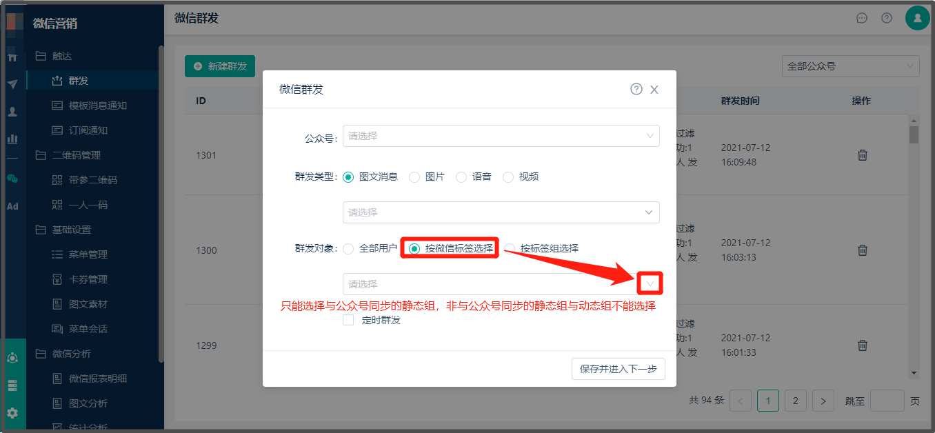 指与微信标签组同步的[静态标签组](%E9%9D%99%E6%80%81%E6%A0%87%E7%AD%BE%E7%BB%84.md),此处不能选择[动态标签组](%E5%8A%A8%E6%80%81%E6%A0%87%E7%AD%BE%E7%BB%84.md)