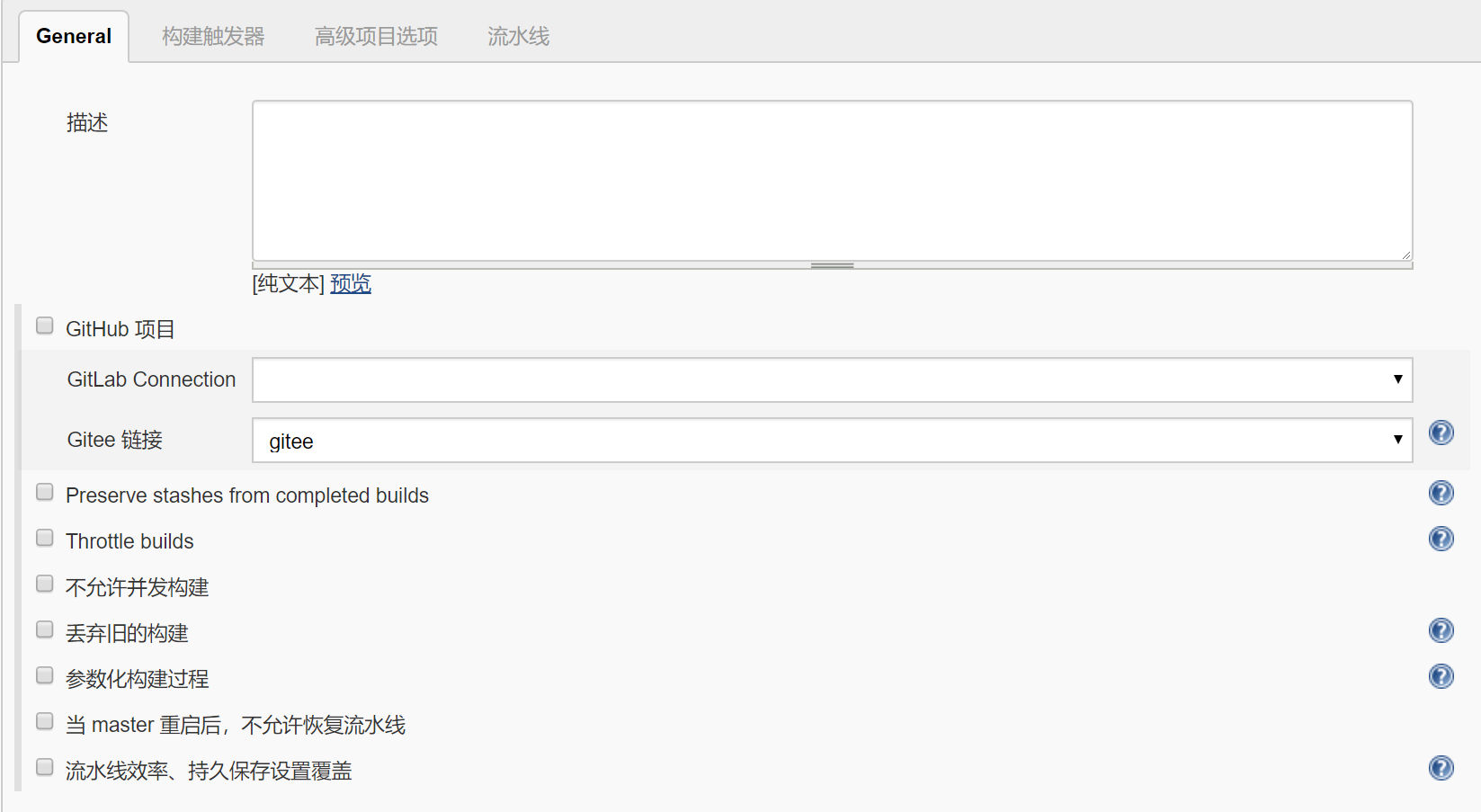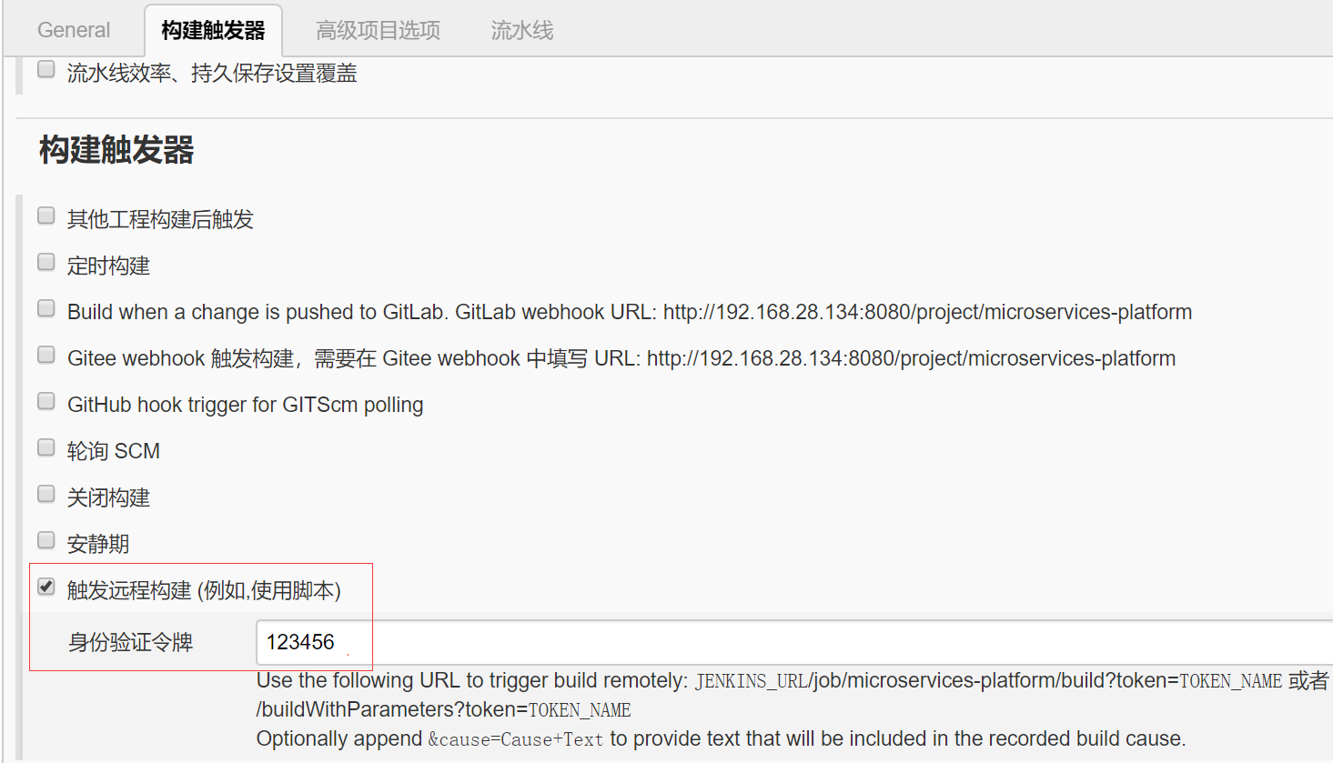如果需要通过git触发构建的话需要勾选`触发远程构建`和填写`身份验证令牌`
