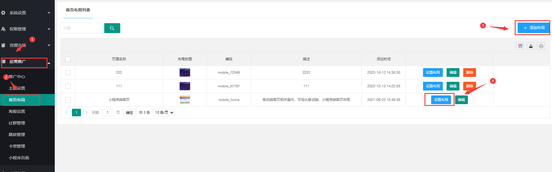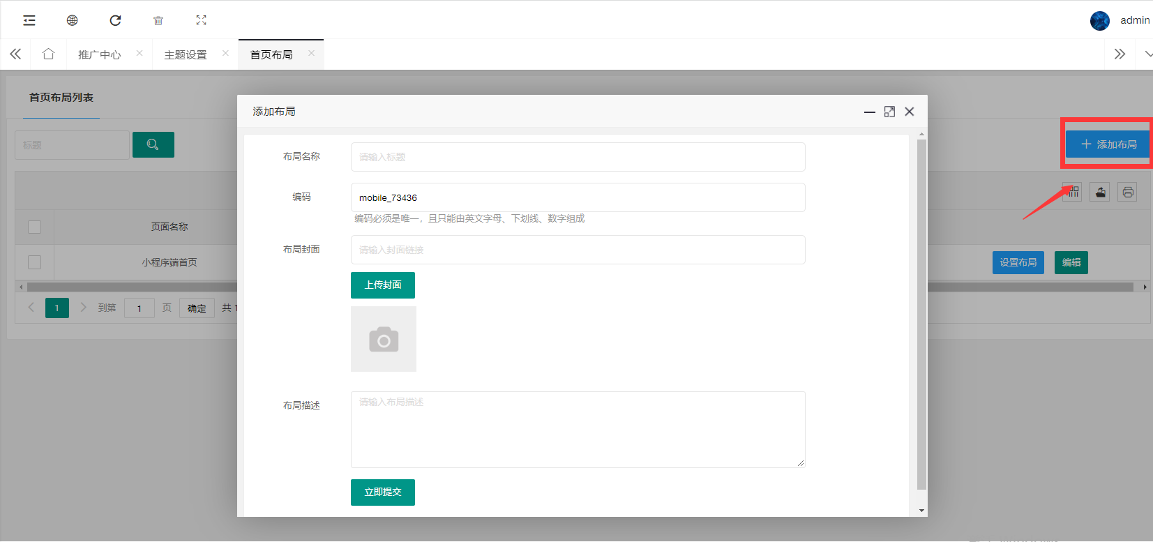 > 1、点击设置布局 ,可添加前端小程序首页布局