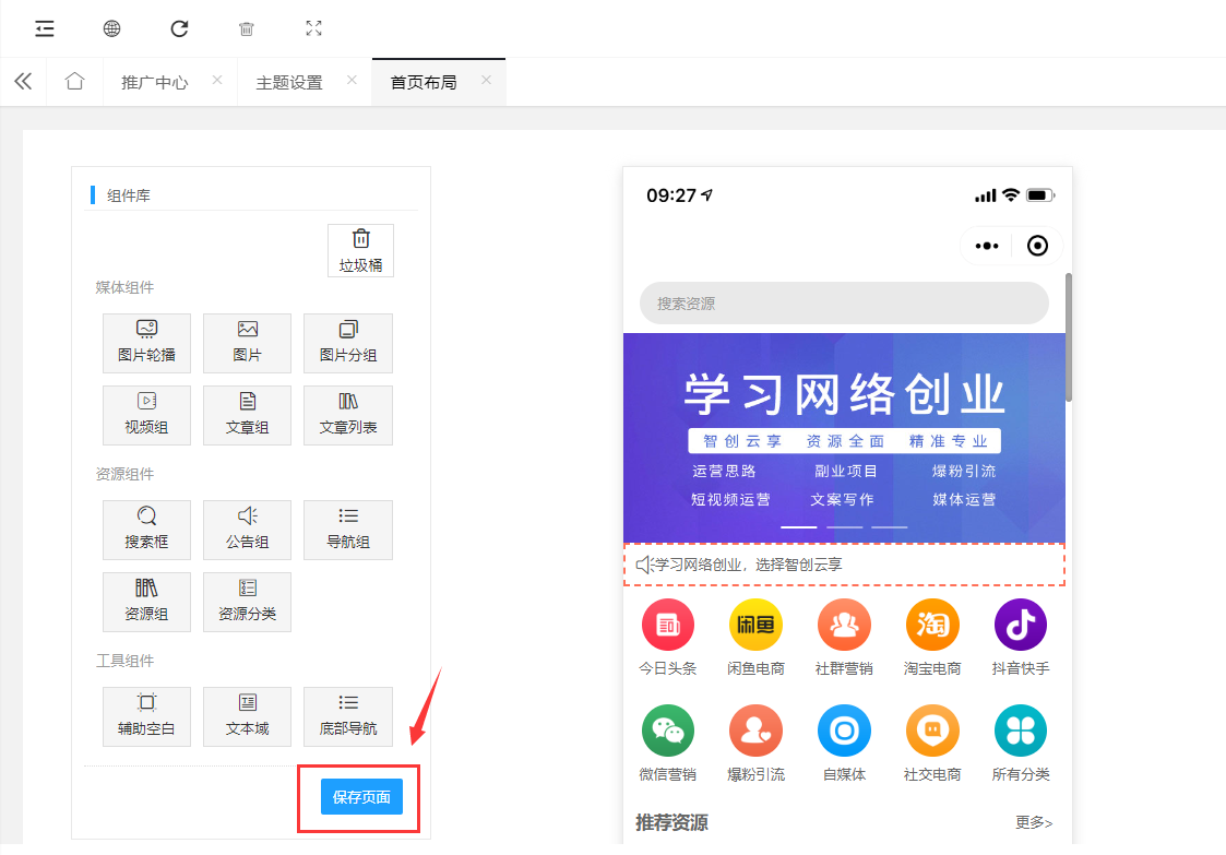 > 自定义设置首页布局,**温馨提示:修改完成请点击保存**