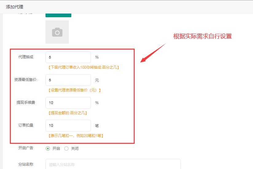 > 2.5、是否开启前台广告:单独设置代理广告是否显示。(避免代理因广告过多而影响运营)