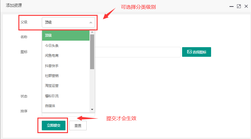 > 资源分类中网站中所有资源的类别,可在此添加新的分类资源