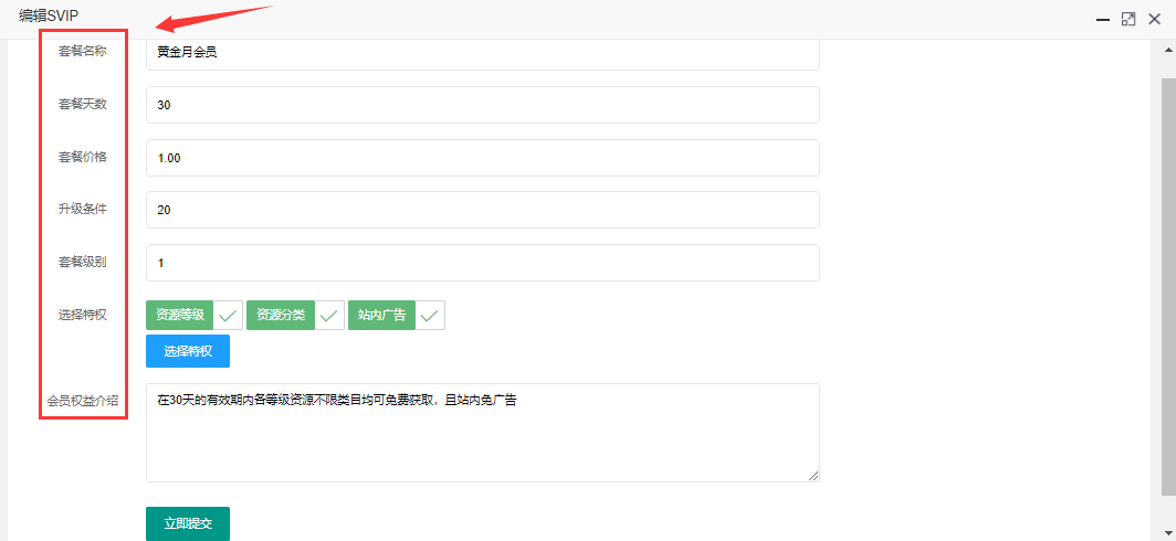 > 1、套餐名称: 例如黄金会员