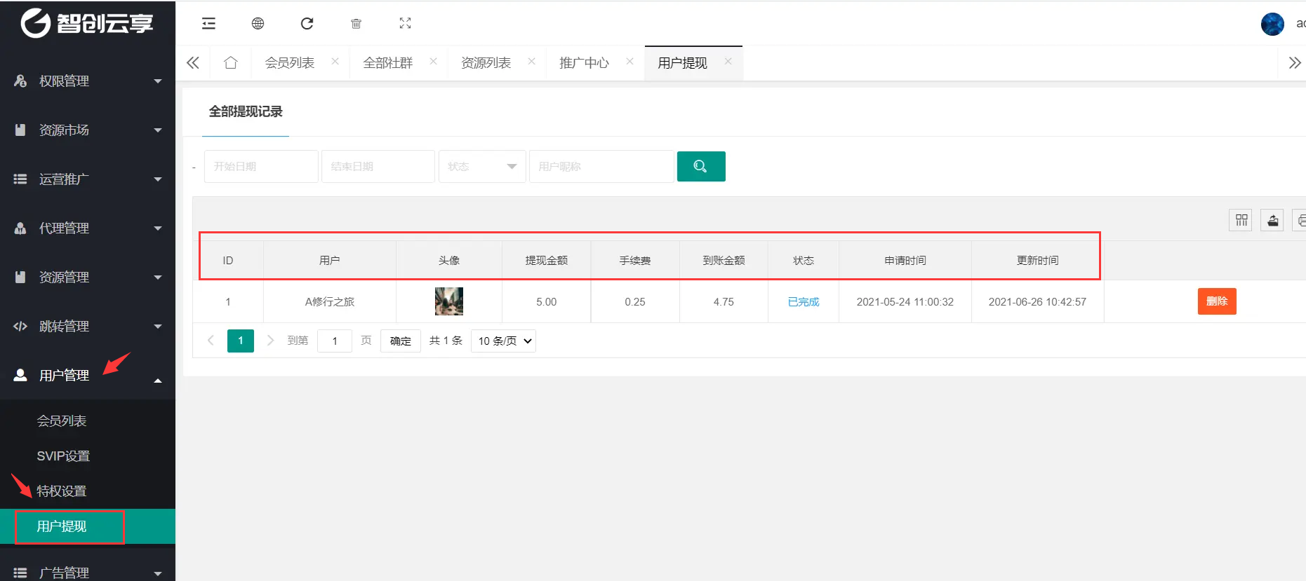 > 前端用户的提现均需要经过管理审核才会自动转账