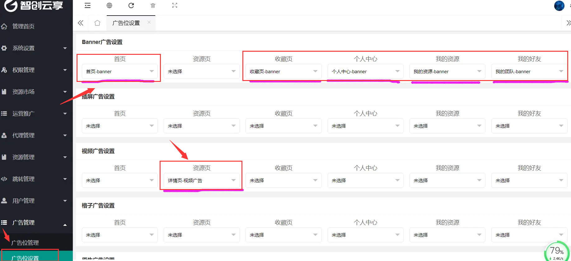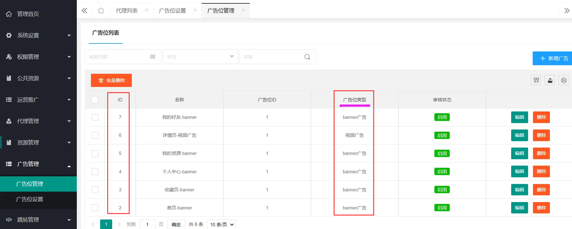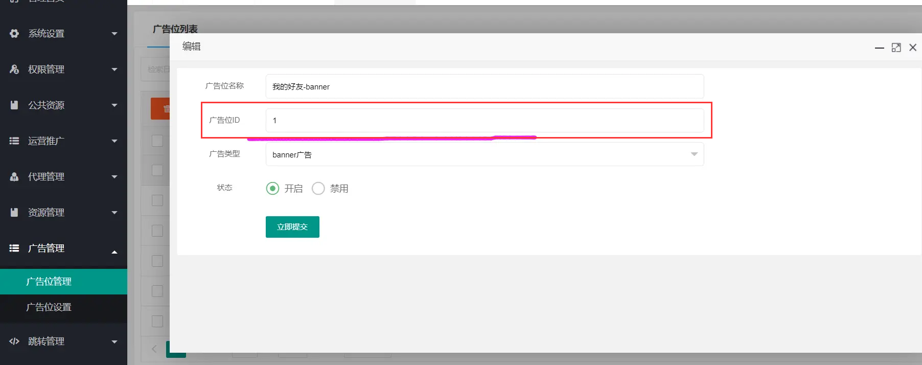 > 3.3、在【广告位设置】找到对应广告类型的广告位点击编辑,填写获取到的广告位ID