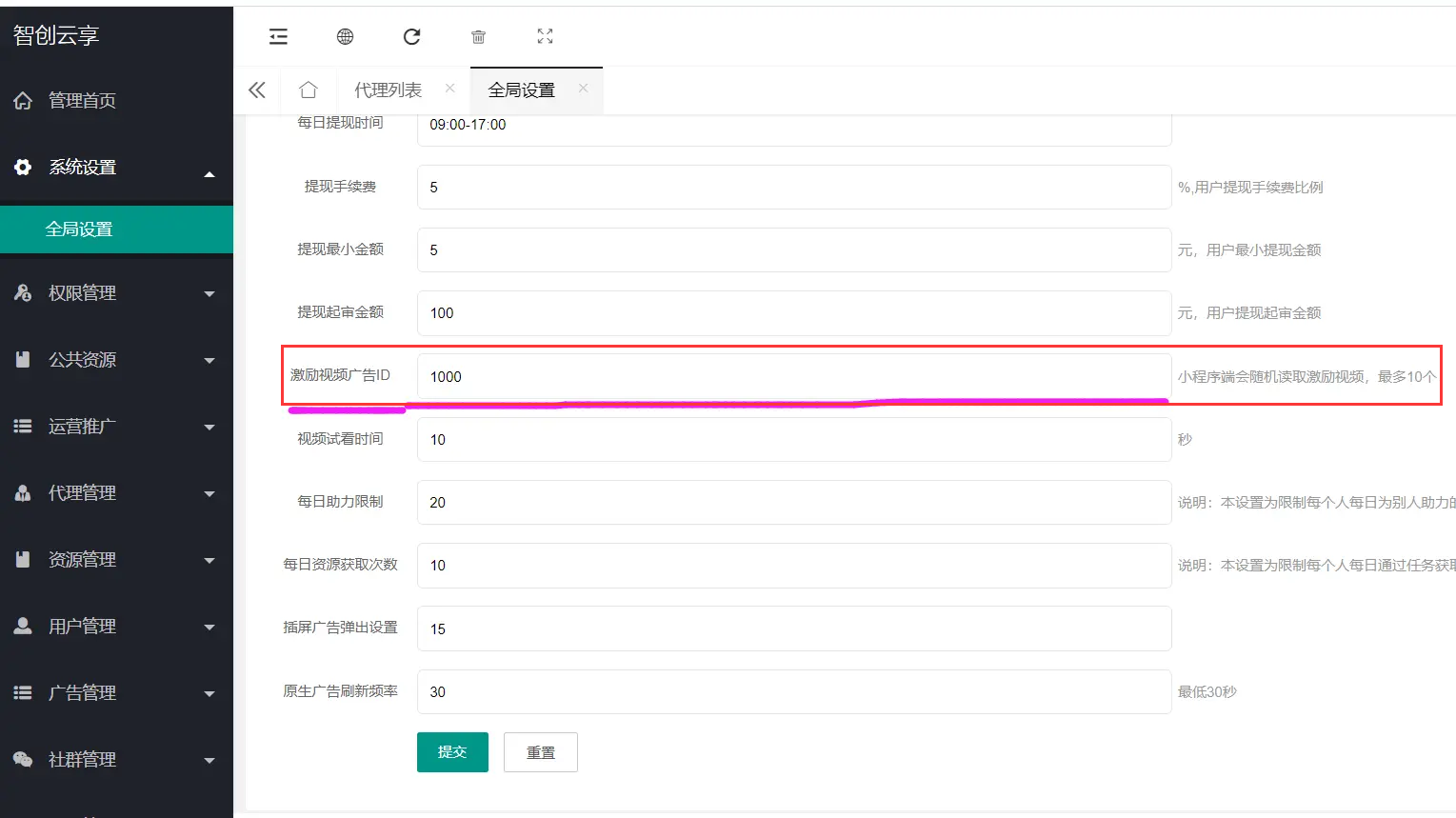 > 4.2、在【激励视频广告ID】处填写获取到的广告位ID,多个ID用英文逗号,隔开