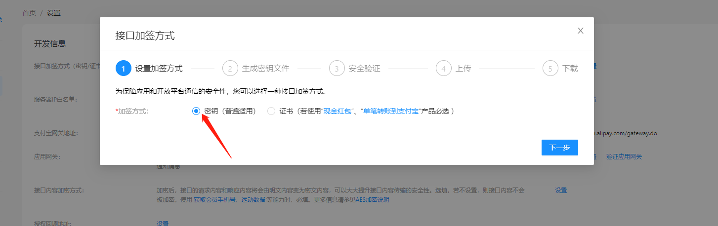 接口加签方式选择第一个秘钥,下载秘钥工具地址[https://opendocs.alipay.com/common/02kipk](https://opendocs.alipay.com/common/02kipk)