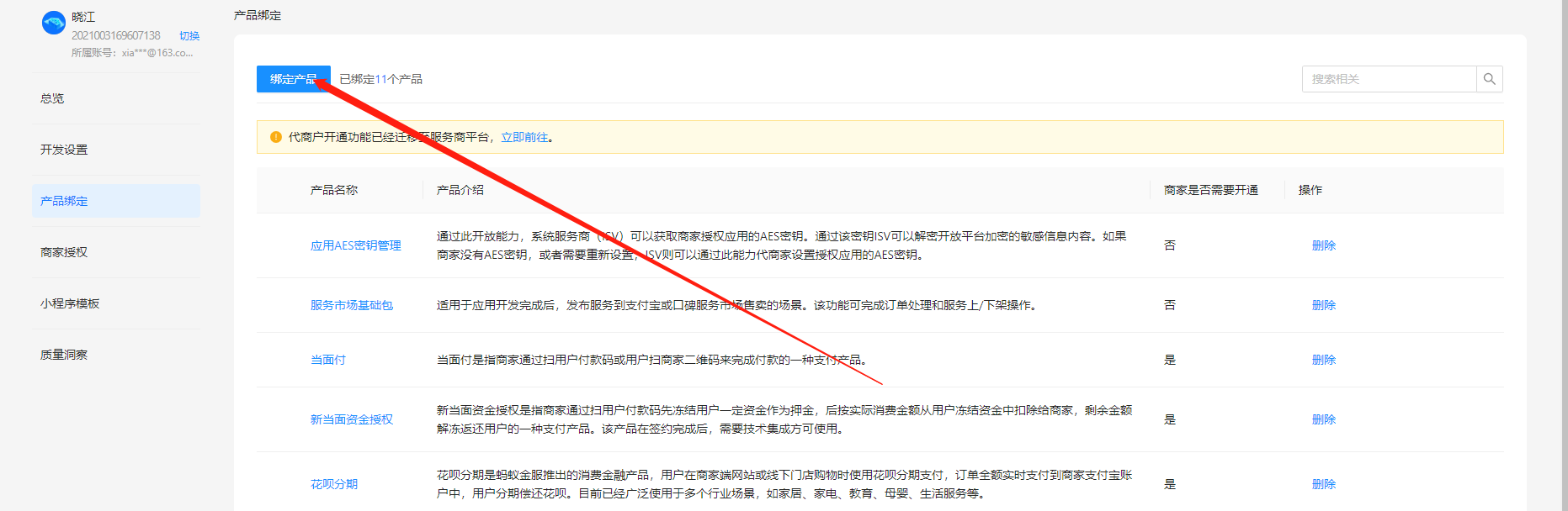 4.绑定产品,绑定当面付、花呗分期、新当面资金授权三个产品