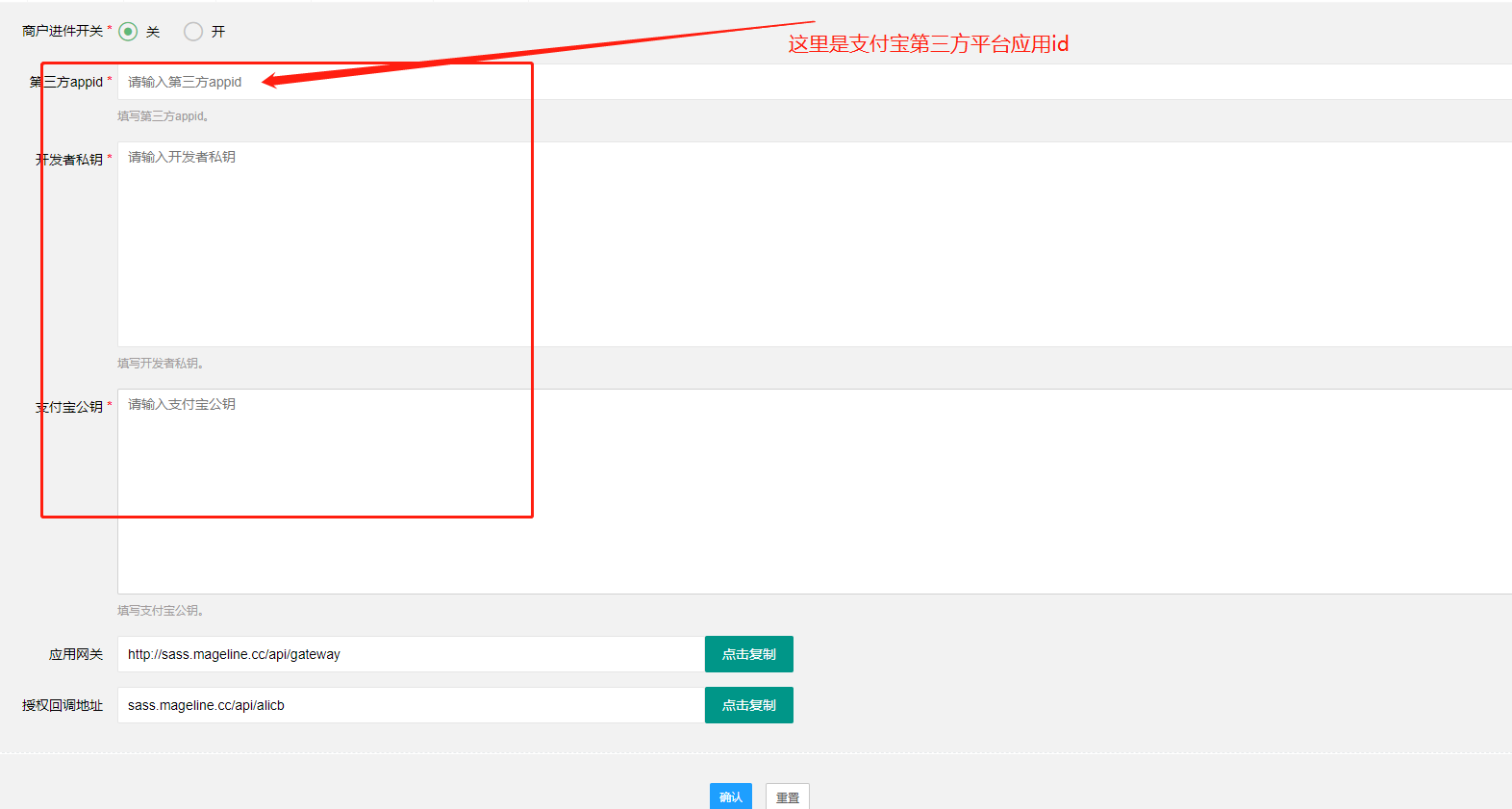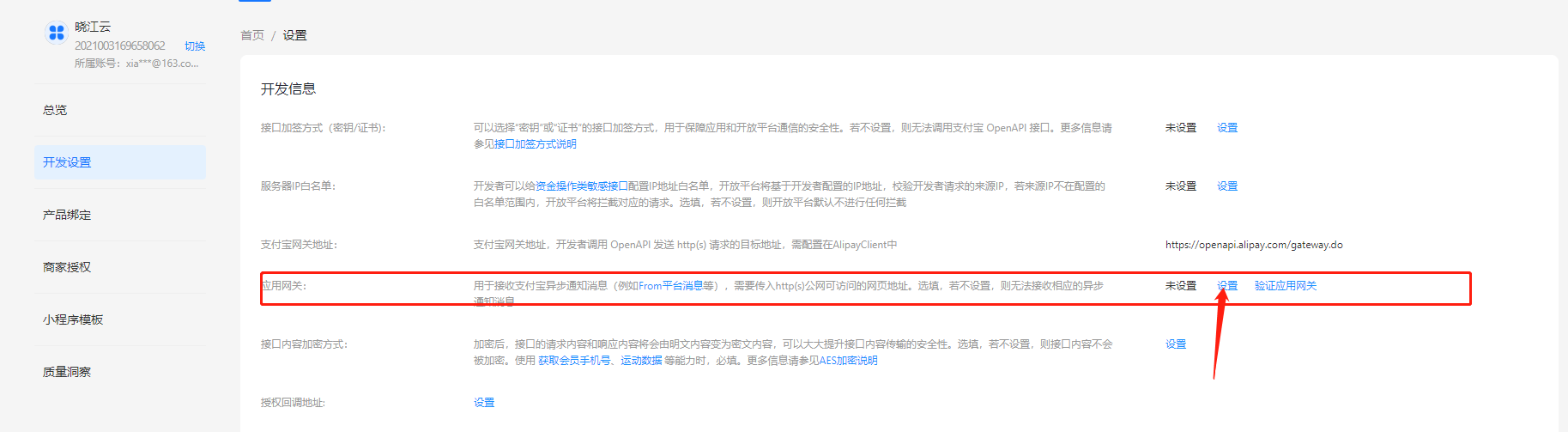 开发配置里只需要设置网关即可,其他不用管,网关地址在系统后台支付宝设置里直接复制过来,选https协议!
