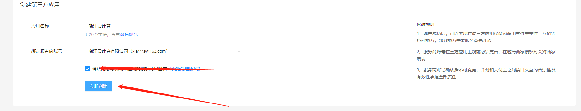 2.填写相关应用信息(应用名称、绑定支付宝服务商账号),然后点击 确认创建。请注意:请应用名称请不要填写类似于xx贷款、xx信用卡、xx支付、借贷、刷单、短信轰炸机、一元购等名称,此类名称会被定义为非法名称。