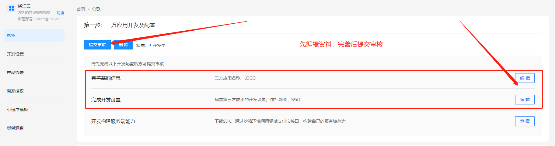 3.完善第三方平台信息,然后提交审核