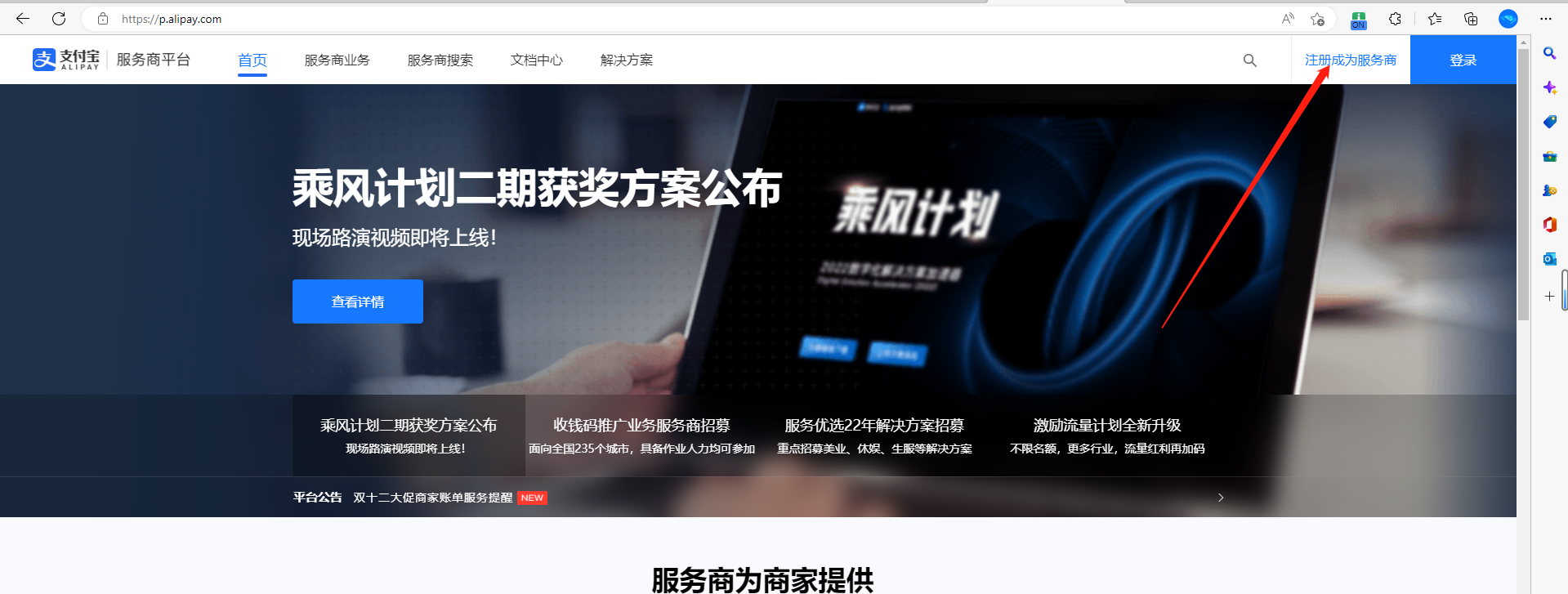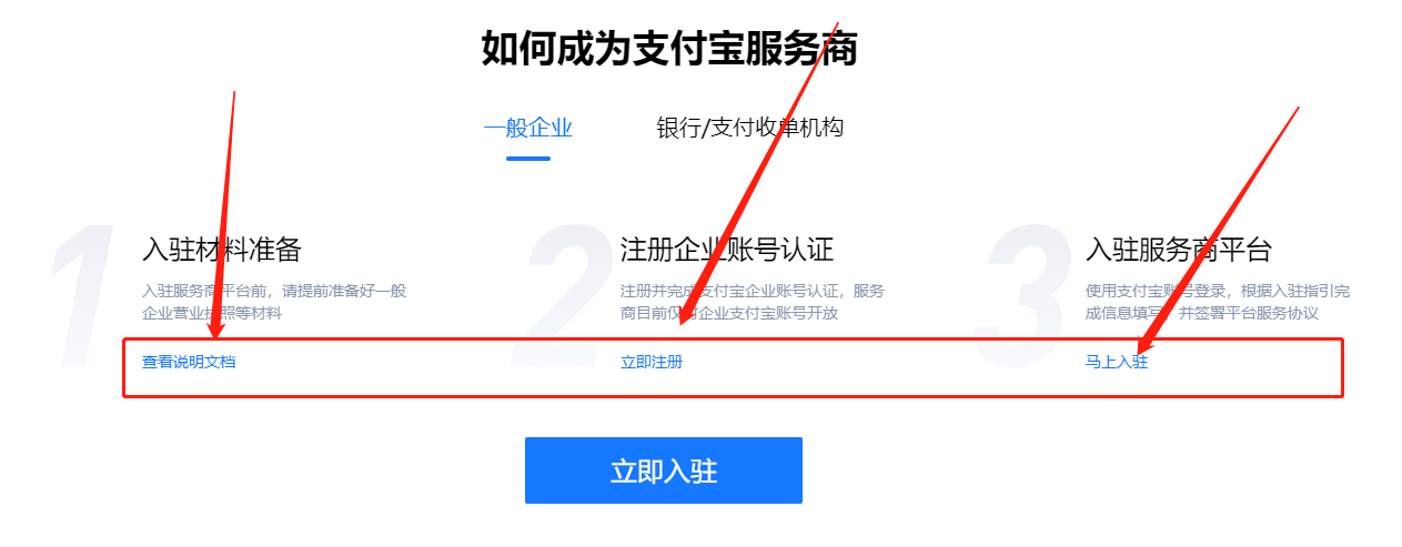 申请地址:[https://p.alipay.com/](https://p.alipay.com/),按页面提示先看入驻材料,在注册企业支付宝,注册认证企业支付宝后再入驻服务商平台,操作指引地址:[https://opendocs.alipay.com/p/00ubpa](https://opendocs.alipay.com/p/00ubpa)