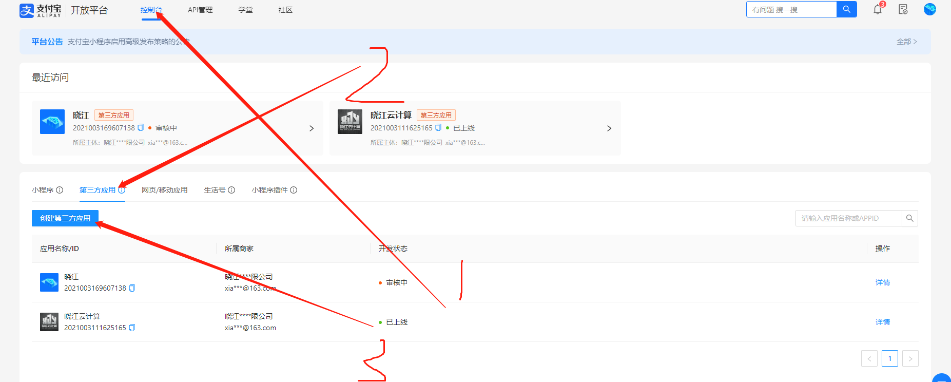 1.创建第三方应用。登录[支付宝开放平台](https://open.alipay.com/),控制台->我的应用\[创建应用\]->第三方应用->创建第三方应用