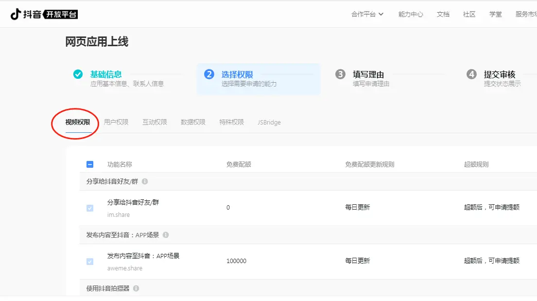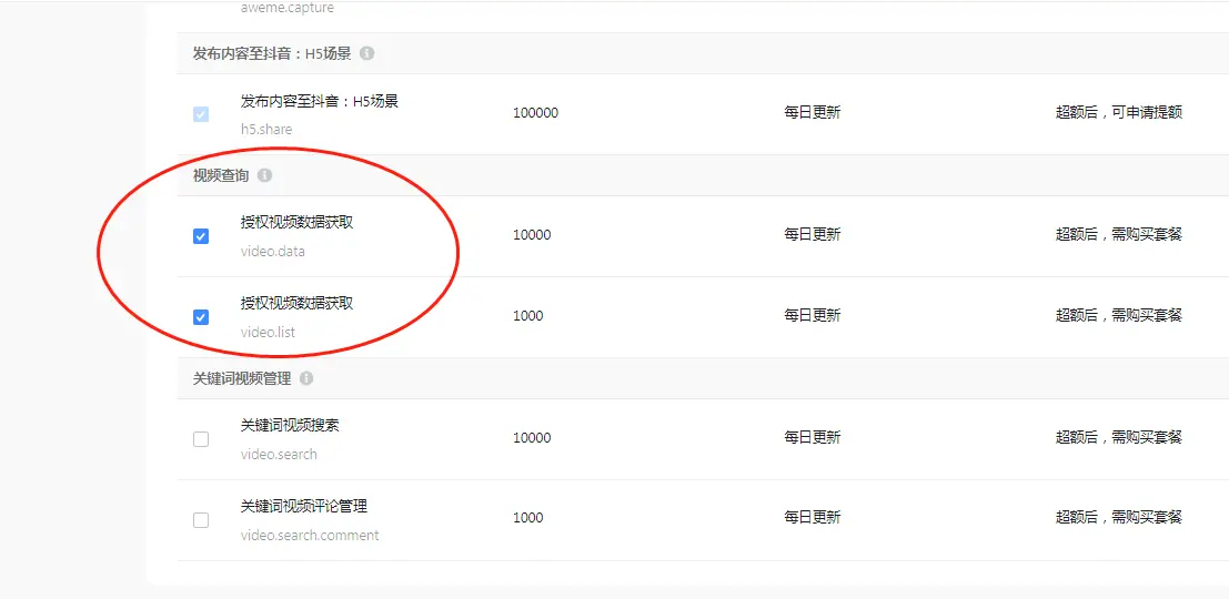 选择权限,权限必须要包含视频查询的授权视频数据获取video.data和授权视频数据获取video.list两个权限:
