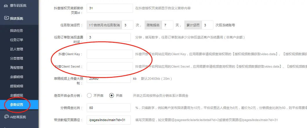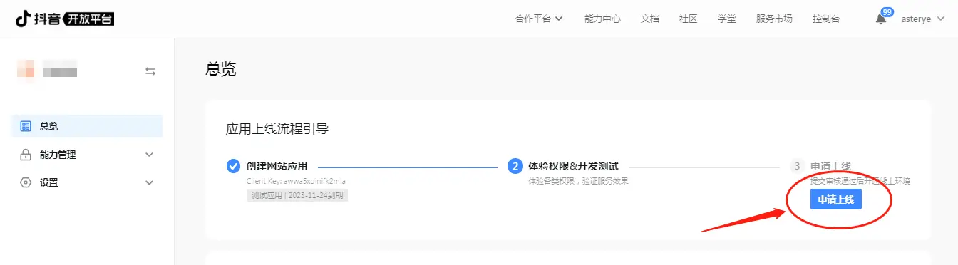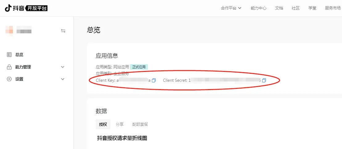 审核通过后,打开应用,复制应用的Client Key和Client Secret填到系统后台: