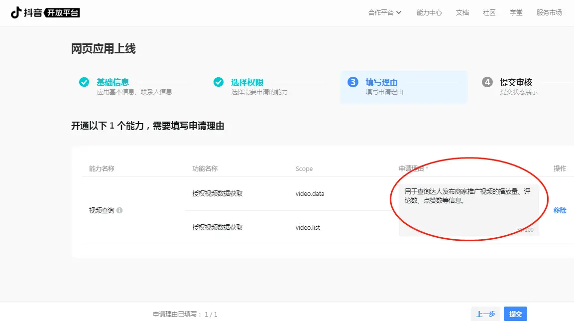 勾选好视频查询权限后,点击下一步,填写申请理由: