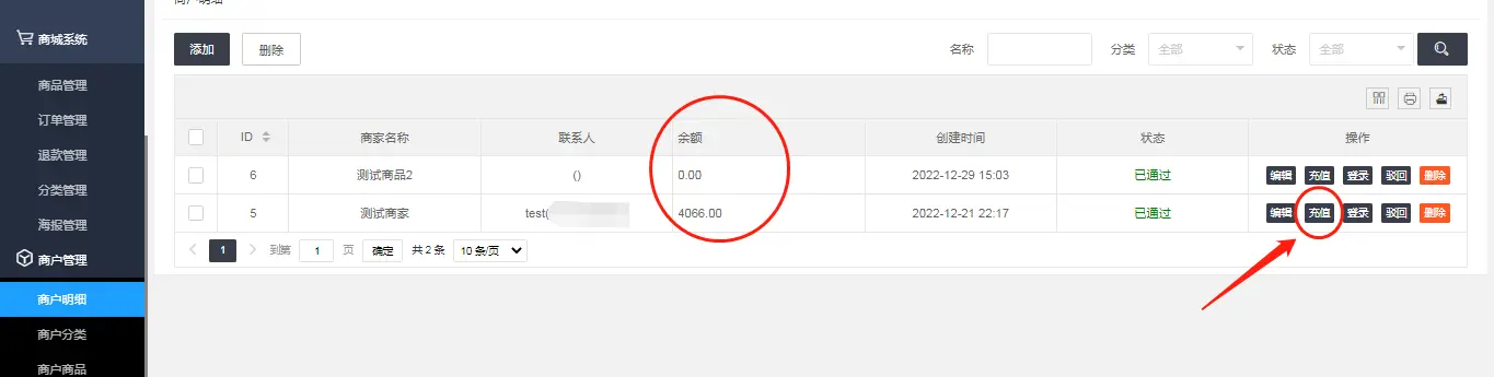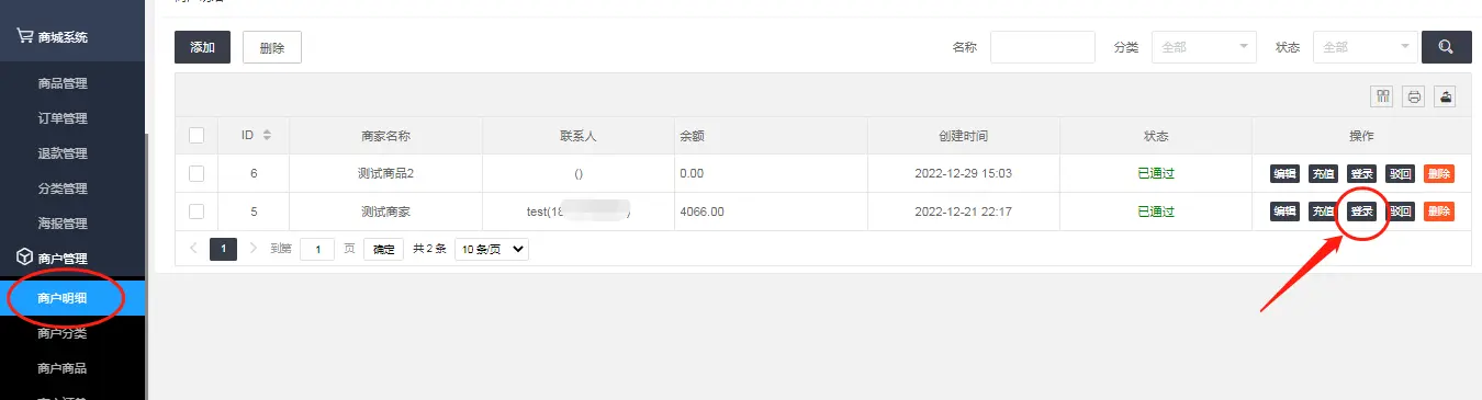 使用商户账号密码登录商户后台或者在【商城系统—商户管理—商户明细】找到相应的商户,登录商户后台: