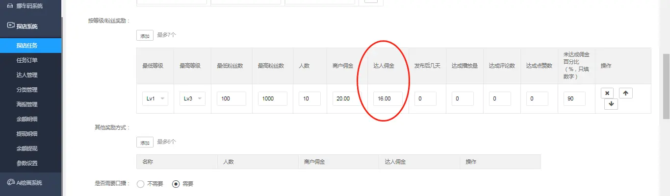 商户发布的佣金与达人佣金之间的差价,即为平台利润,如上图所示,商户发布的任务为20元/人,平台设置给达人的佣金为16元/人,差价4元/人即为平台利润。