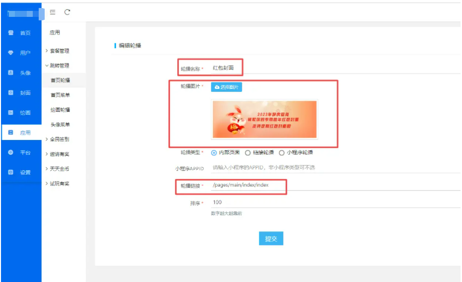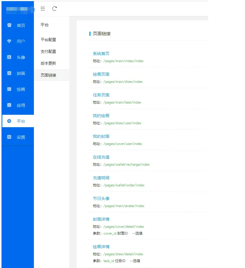 首页轮播的图片和连接就在这里写,连接不知道在哪的,可以点击平台-页面连接查看
