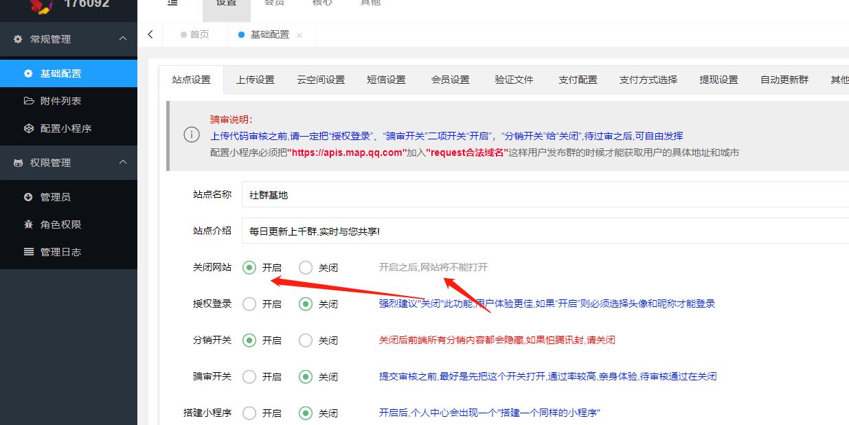 传代码审核之前,请一定把“授权登录”、“骗审开关”、“关闭网站”二项开关“开启”,“分销开关”给“关闭”,待过审之后,可自由发挥