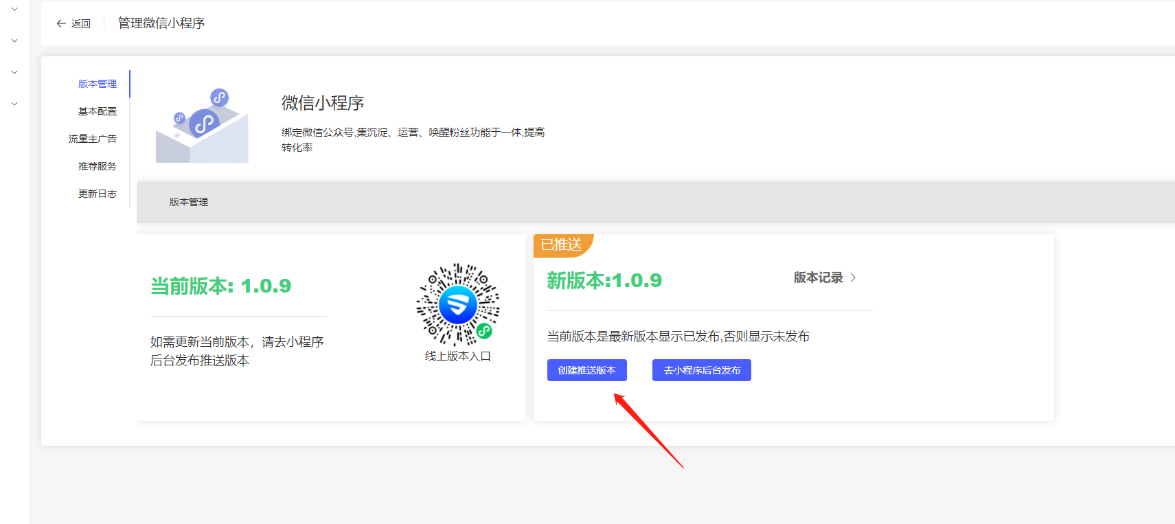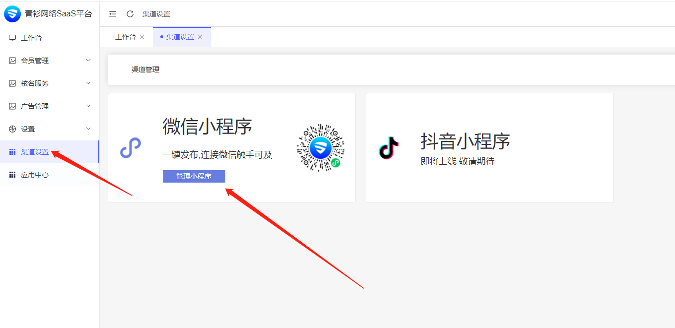 点击渠道设置,点击管理小程序,进入发布页面