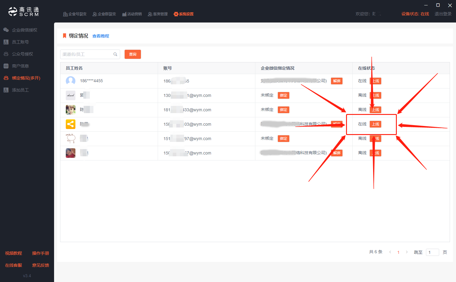 1、请打开“系统设置”--“绑定情况”确定添加的人员是否绑定,且在线状态为“在线”
