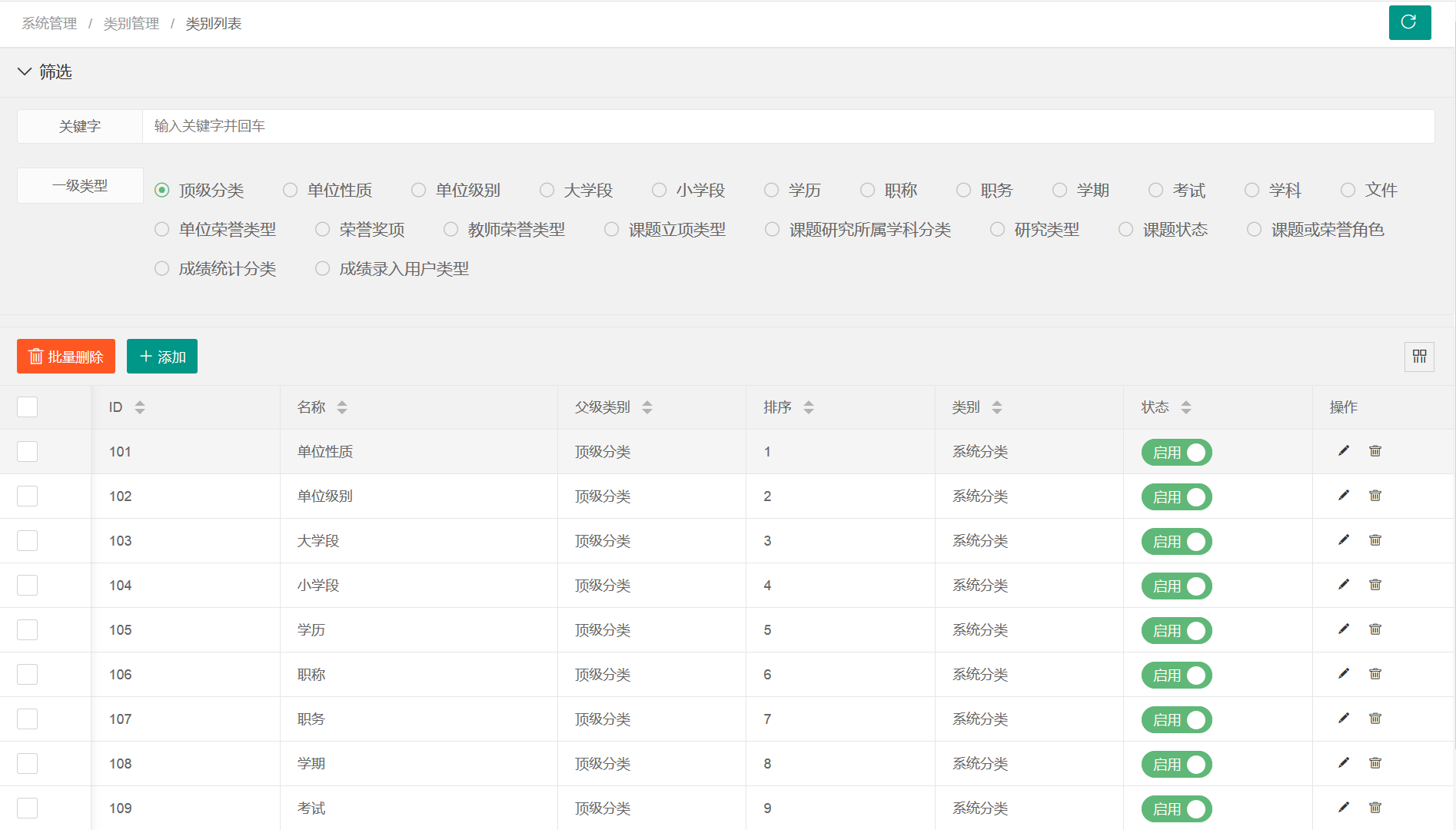 >[success] 类别会与教师、学生、学期、单位、考试等信息相关系,在这些信息的设置与显示中,类别会以下拉菜单或者是单选、多选的形式出现,不建议频繁地改动类别。