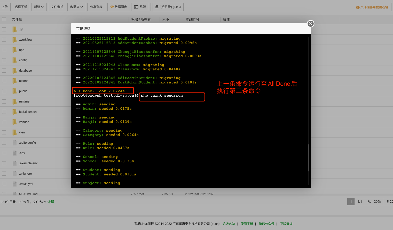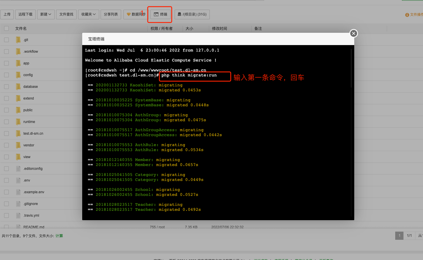 在根目录中,使用“终端”,依次输入以下命令,将信息写入数据库。**