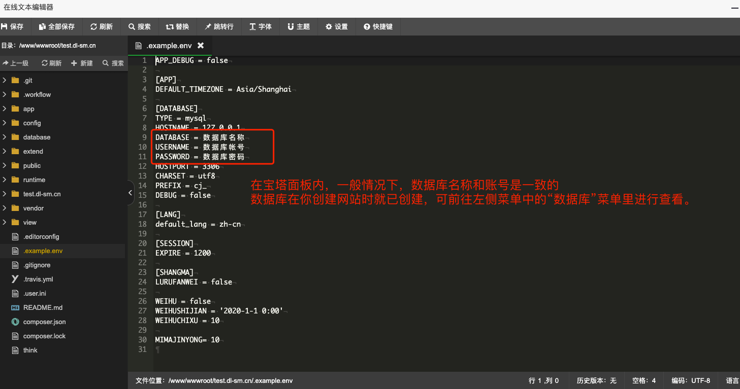 **(5)双击“.example.env”文件,以配置数据库信息,并保存文件。**