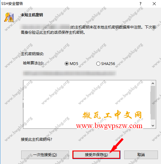 在连接过程中会弹出警告信息“未知主机密钥”,选择“接受并保存”: