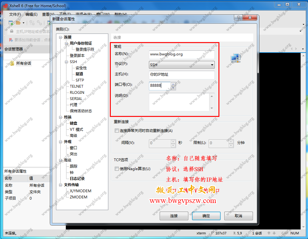 在下图连接常规选项中填写“IP”和“端口”,名称随意写,协议选择默认的“SSH”: