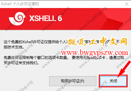 如果第一次使用 Xshell 6 还会有购买提示,点击关闭就行,免费版依然强大: