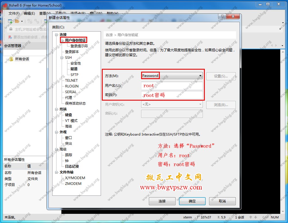 信息填写完毕后在左侧面板选择“用户身份验证”,填写VPS的用户名和密码,用户名是“root”、密码是你的“root密码”,在方法一栏选择默认“Password”即可: